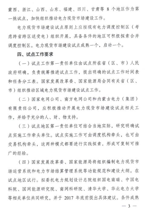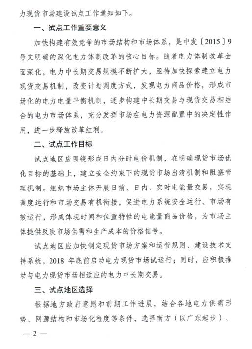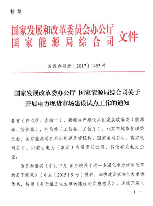 国家发展改革委、国家能源局于8月28日联合下发了《关于开展电力现货市场建设试点工作的通知》特急文件,通知中称,2018年底前启动电力现货市场试运行,积极推动与电力现货市场相适应的电力中长期交易。结合各地电力供需形势、网源结构和市场化程度等条件,选择南方(以广东起步)、蒙西、浙江、山西、山东、福建、四川、甘肃等8个地区作为第一批试点,加快组织推动电力现货市场建设工作。